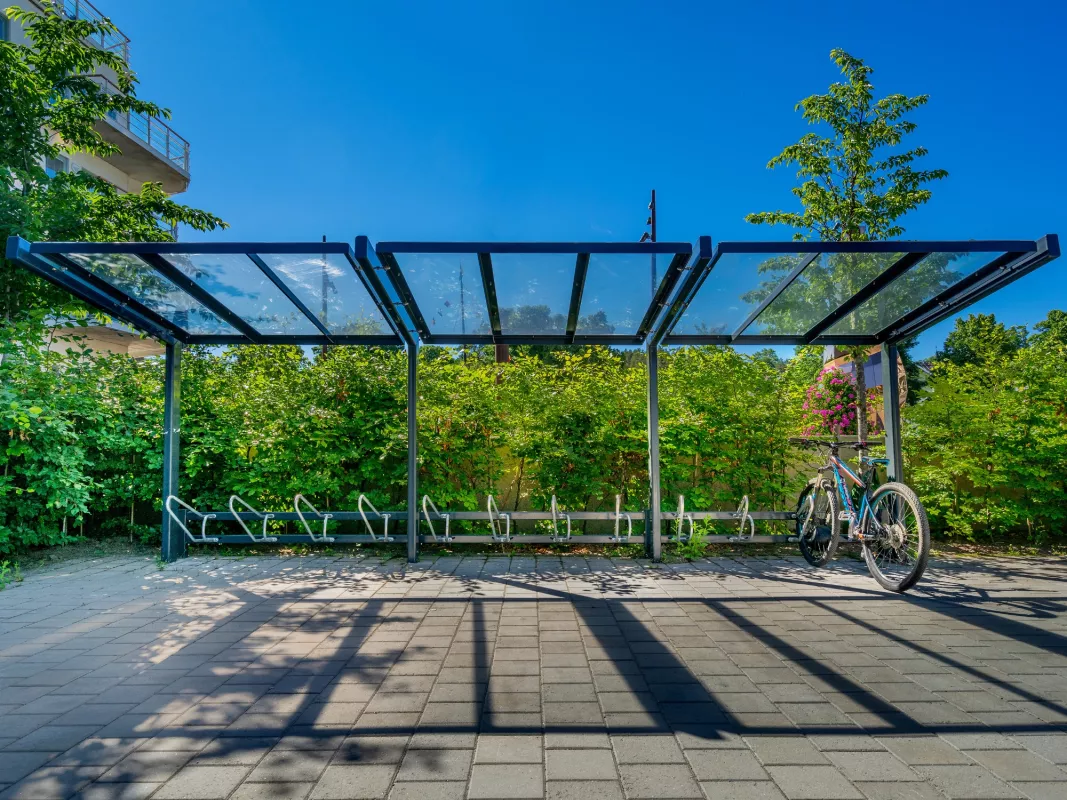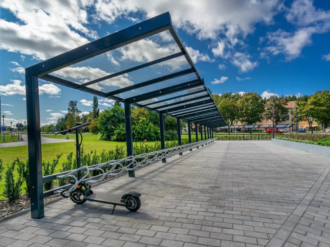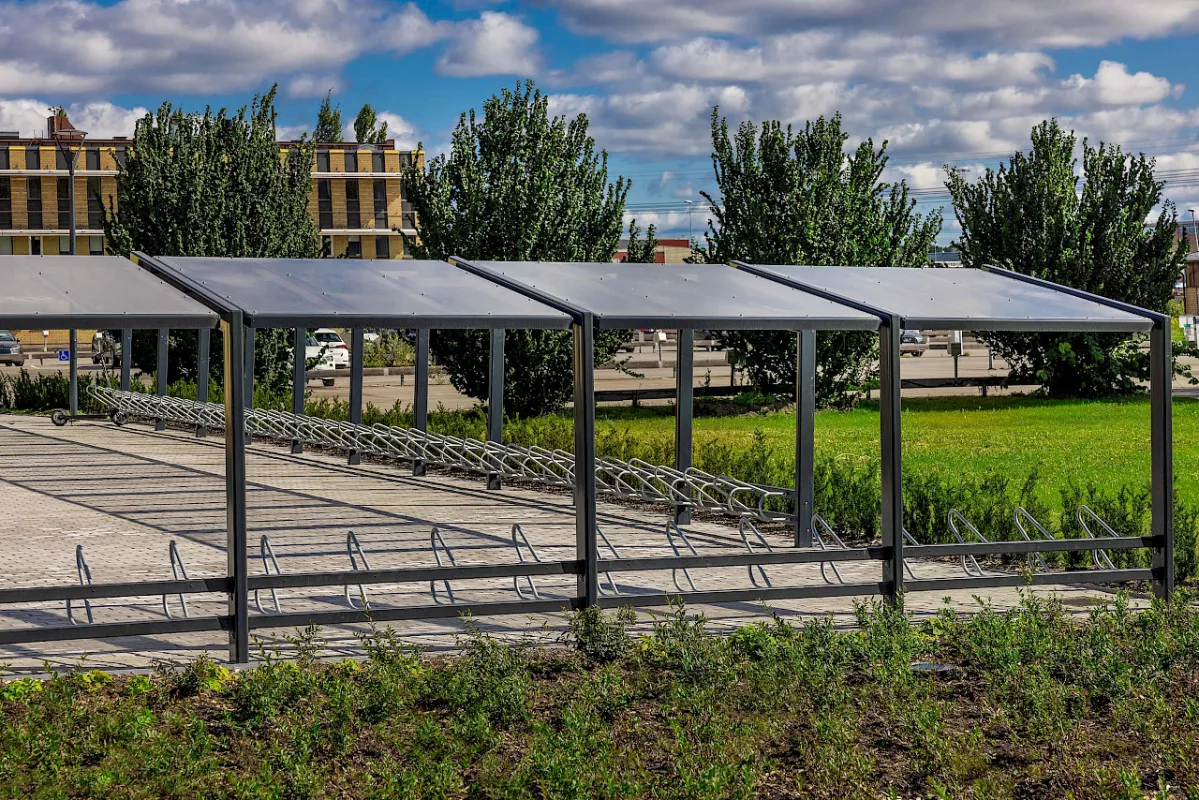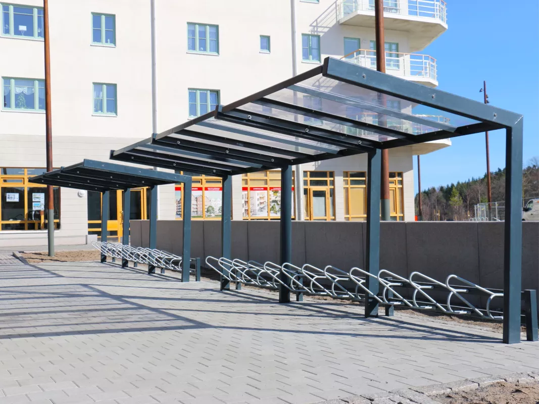 Stoere maar knappe fietsenstalling die opvalt door zijn licht schuine, verticale kokers en zijn transparante polycarbonaten dak. Bestaat in enkelzijdige en dubbelzijdige uitvoering en kan eindeloos verlengt worden. Optioneel ook verkrijgbaar met "groendak".