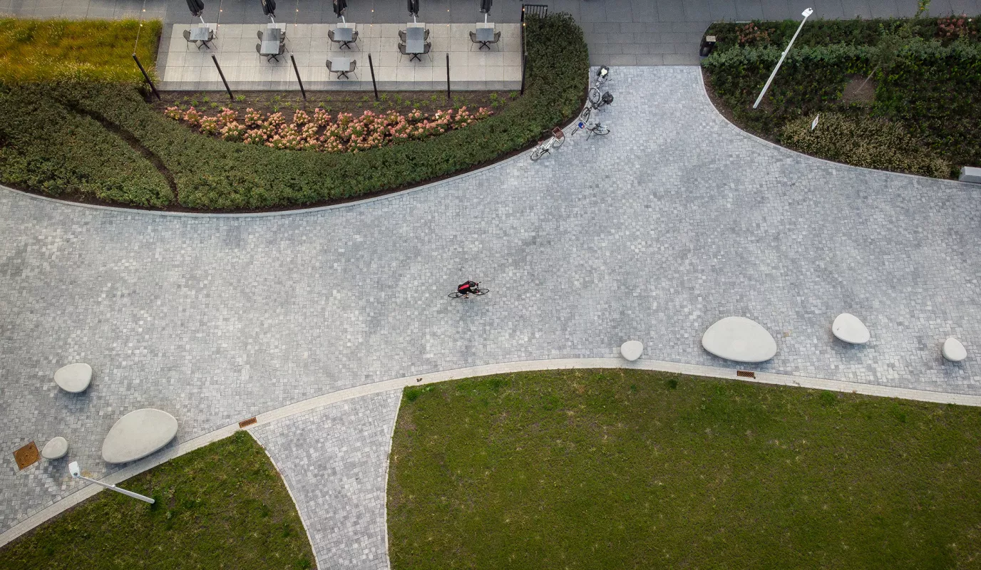 De kloeke, organisch gevormde SUPERCELL© zitelementen lieten zich naadloos integreren in het prachtige urbane ontwerp en bieden een rustpunt aan vermoeide benen.