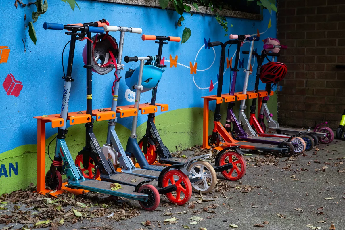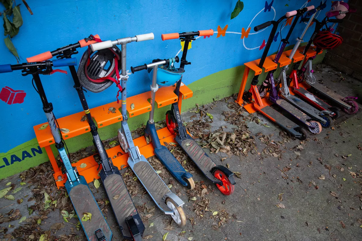 Voortaan stallen de steppende kinderen van de St.-Juliaan de Vlindertuin hun tweewielertjes in Panache’s robuuste step-rekjes. Deze onverwoestbare, dikwandige stalen rekken zijn voorzien van een uitsparing voor de wielen en de stuurkolom waardoor de stepjes netjes recht staan. Zo wordt parkeerchaos vermeden en blijven ook de stepjes onbeschadigd.