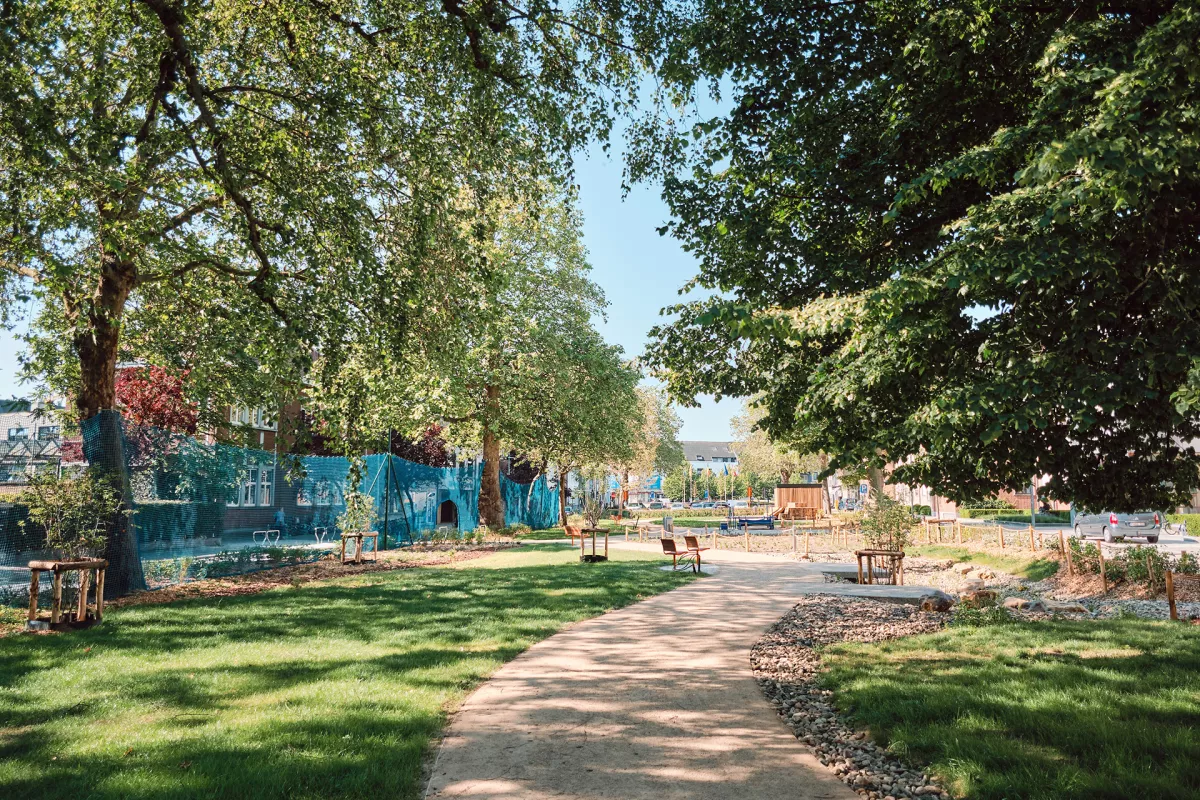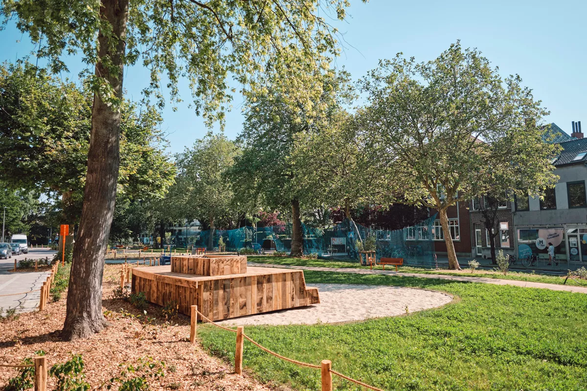 Het Kortrijkse Groeningepark was vroeger een een grauwe, volgeparkeerde asfaltvlakte. De Stad Kortrijk besliste het om te toveren tot een groene en sympathieke openbare ruimte waarin de jeugd van de nabijgelegen school, de buurtbewoners en de senioren van het woonzorgcentrum kunnen genieten van rust, groen en stilte. Buro Cnockaert bedacht een boeiend parkontwerp waarin ook Panache straatmeubilair een rol mocht spelen.